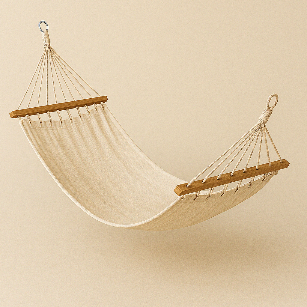 Esta hamaca está fabricada en lona suave de algodón mezclado en tono crema, ideal para exteriores por su resistencia y transpirabilidad. Las varillas de madera clara mantienen la forma abierta y estable, facilitando el acceso y mejorando el confort. Su diseño clásico se integra perfectamente en entornos naturales, ofreciendo un rincón de descanso perfecto entre árboles, en porches o terrazas.